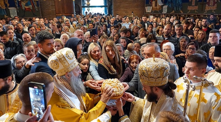 Зато и не треба да нас чуди, браћо и сестре, да када смо читали овај одломак из Јеванђеља по Луки, у којем се описује како мноштво народа се окупља око Спаситеља, са разним потребама, и сви заправо хоће да буду исцељени и то у потпуности исцељени. Није чудо, јер с једне стране, као иконе Божије, створени смо да савршенство, да светост, да непролазност, да пуноћу можемо остварити само у Христу. И није чудо јер и овде у овој причи Господ се потврђује и показује као љубав. Свима излази у сусрет, али наравно, тај излазак Христов у сусрет онима који Њему приступају, доноси плода тамо где је испуњен најважнији основни предуслов – предуслов који се тиче човека и зависи од човека, јер Господ баш због тога што је љубав, ништа не чини насилно. Па чак неће ни да нас грли и да нас свије на Своје груди ако ми то не желимо. Зато је потребан тај предуслов који се зове слобода наша, која се потврђује, открива и показује кроз веру, кроз веру нашу у Христа Исуса Господа и Спаситеља нашега. Јер шта је вера? Вера је исповедање наше; вера је наш излазак из наше самозатворености и самодовољности; вера наша је вапај; вера наша је потврда да знамо да нисмо довољни себи, да смо пролазни, да смо слаби, да смо немоћни, да смо грешни. И у исто време, вера је израз поверења нашега у Христа: да је Он почетак и крај и да од Њега све зависи, да све што имамо и што јесмо од Њега смо добили, Његов је дар. И зато је потребна вера као успостављање заједнице и јединства са Богом Свемоћним и Богом љубави, где онда кроз веру низводи се благодат Божја, улази у наш живот и све преображава, све постаје ново, све постаје другачије. Све обележено благодаћу Божјом њом запечаћено постаје свето. Вером ми разумемо реч: Будите савршени као што је савршен Отац ваш небески и знамо да савршенство није апстрактна формула и формулација, није празно слово, него знамо да је то реалност свакоме од нас доступна. Јер светост је Бог, светост је у Њему, а Он је са нама и међу нама. И ако смо прикачени, привезани вером својом за Њега, онда и ми учествујемо у Његовој светости. И све то јесу, браћо и сестре, наша старија и најдража, најмилија браћа и сестре наше, светитељи Божји, светитељке Божје. Они којима је вера постала све и који су кроз веру своју и подвиг уподобили себе Господу Христу, постали Христоносци, постали сведоци љубави Христове, а Господ их је онда просветио и просветлио и осветио, да и они буду нама и покровитељи и заступници пред Њим, али и пример заувек.