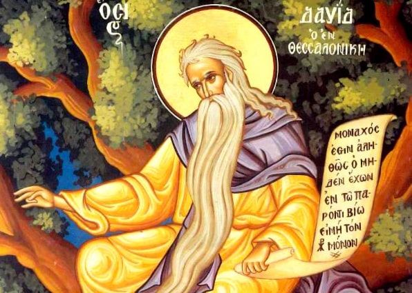 Овај блажени отац роди се на Истоку, и као пресјајна звезда засија на Западу. Он за младости напусти свет, сроднике, пријатеље и све богатство, и са љубављу пође за Господом својим. Силним уздржањем он покори телесне страсти, и јави се као неки анђео у телу. А беше осим уздржања још и веома смиреноуман. Читајући Свето Писмо и житија светих мужева он се труђаше да им подражава, а особито светим столпницима. Настанивши се близу града Солуна, он се подвизаваше на једном бадемовом дрвету седећи без ичега на његовим гранама. Ту он као милогласна птица, утешаваше корисним саветима све оне који прибегаваху њему. Његов ум беше устремљен свагда ка божанској висини, зато га Бог обогати даром чудотворства, и он постаде светозарни стуб Цркве, који својим чудесима просвећиваше све.