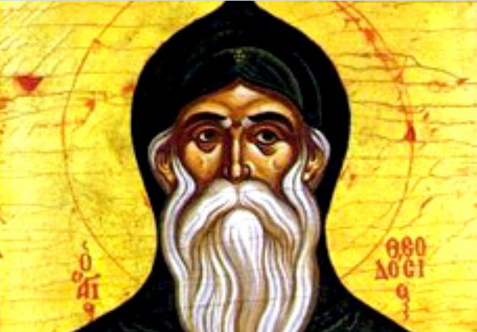 Преподобни Теодосије рођен је у области Кападокији, у селу Магариси, од благочестивих родитеља: оца Проересија и мајке Евлогије. Би васпитан у доброти, и изучи школе. А када постаде пунолетан и добро изучи Свето Писмо, одредише га да у цркви чита људима из Светих књига, јер беше слаткогласан и искусан читач као нико. Читајући поучне речи слушаоцима, он се најпре сам поучавао. Јер слушајући како је некада Господ наредио Авраму да иде из земље своје и од рода свог, и опет како у Еванђељу Господ саветује да човек ради вечнога живота остави оца и мајку и браћу, он пламтијаше срцем и гораше духом да све остави и пође за Христом путем уским и мучним. Размишљајући стално о томе, он се мољаше говорећи: Покажи ми, Господе, пут свој, и ићи ћу у истини твојој (Пс. 85, 11). Затим, ослањајући се на Бога, он крену у Јерусалим за време царовања Маркијанова, када се већ скупљаху свети оци на Четврти Васељенски Сабор у Халкидону против Диоскора и Евтихија. Пролазећи пак кроз Антиохију блажени Теодосије зажеле да види преподобног Симеона који се на стубу подвизавао, и да испроси од њега благослов и молитве. Стога пође к њему, и кад се приближи стубу, чу преподобног где му довикује: Добро дошао, човече Божји Теодосије! – Чувши где га по имену зове човек који гa никада видео није, нити га познавао, Теодосије се удиви, и павши на колена, поклони се прозорљивом оцу. Светитељ га позва к себи, и он се пoпe на стуб, и припаде к чесним ногама његовим. А овај загрли и целива богонадахнутог младића, и прорече му да ће бити пастир словесних оваца, и да ће многе отети од духовних вукова. И претсказа му и друге неке ствари и, пошто га благослови, отпусти га.