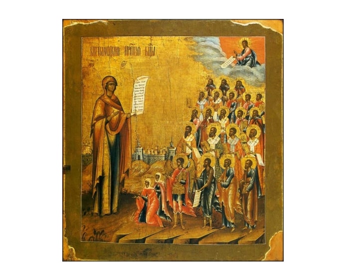 Богољубива Царице, Неискусомужна Дјево, Богородице Марија! Моли за нас од Тебе Љубљеног и Рођеног од Тебе Сина Твога, Христа и Бога нашега, подари нам остављење прегрешенија, мир нам подај, земљи плодова изобиље, и свему роду људском спасење. Градове наше Руске земље од најезде иноплеменика заступи и од међусобних свађа нас сачувај. О, Мати, Богољубива Дјево! О, Царице Свесвета! Ризом Својом покриј нас од свакога зла од видљивих и невидљивих врагова заштити и спаси душе наше.