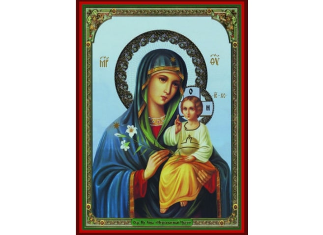 На икони Пресвета Богородица држи у руци бели цвет – симбол неувелости, девства и непорочности.