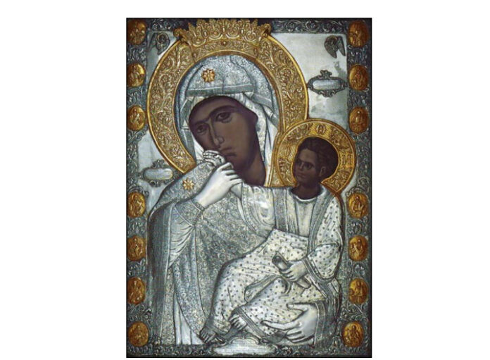 Икона је окована у сребру, са ризом Пресвете изатканоj у виновој лози, с круном од злата на глави Светој. Ореол је такође, сав од злата, као и код Богомладенца Христа; а звезде на раменима и глави Њеној, истоветне. Лице Јој изражава састрадалну љубав, док Јој поглед зрачи красотом и милосрђем. Такво лице није код Богомладенца, већ је пуно строгости и неумољивости. На ивицама иконе угравирано је 7 златних медаљона са ликовима Св. отаца, апостола и Претечом, на свакој страни – док су над главом Свете Богомајке по два Херувима обострано угравирана.