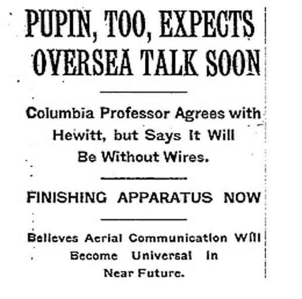 “Бежични телефон ће се користити за разговоре на врло великим растојањима у разумно блиској будућности, сматра др Михајло Пупин са Универзитета Kолумбија, чији је изум индуктивног калема (Пупиновог калема, прим. прев.) омогућио, ако ништа друго, трансконтинентално телефонирање, као што је приказано у понедељак у компанији American Telephone and Telegraph. Доктор Пупин је синоћ рекао да ради на усавршавању инструмента за бежичну телефонију који ће, како је уверен, учинити могућом комуникацију на практично било којој раздаљини.