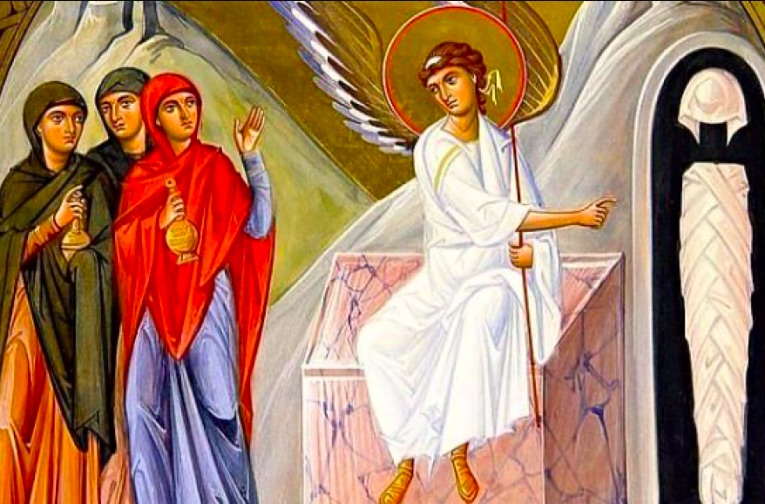 Жене су, дакле, у почетку тајно пратиле Јосифа и Никодима до места погребења, а затим припремиле уља и масти а онда, према заповести Закона, остале код куће током суботе. У суботу увече, Марија Магдалина је дошла до гроба да би се уверила да је све у реду а затим пошла је да купи мирисе, сусревши успут Саломију. У недељу је Марија Магдалина дошла до гроба и видела да је камен одваљен. Она је о том догађају обавестила Петра и Јована и када су се они увери ли да тело није у гробу, отишли су одатле. Господ се најпре јавио њој, али чим је Марија Магдалина отрчала да то јави ученицима, на гроб су дошле Јована и остале жене. Тамо су затекле анђела који им је рекао: „Он је васкрсао!“ После овога, и оне су обавестиле једанаесторицу ученика. Тог истог дана на гроб су дошле Марија Јаковљева и Саломија, а можда и још неке жене. Оне су тамо виделе младића који им је рекао: „Не плашите се! Тражите Исуса Назарећанина распетога? Он је васкрсао!“ Када су жене кренуле да обавесте ученике, Исус се јавио и њима, рекавши: „Радујте се“, и до овога дана радује се свако ко верује у Васкрсење нашег Господа Исуса Христа.